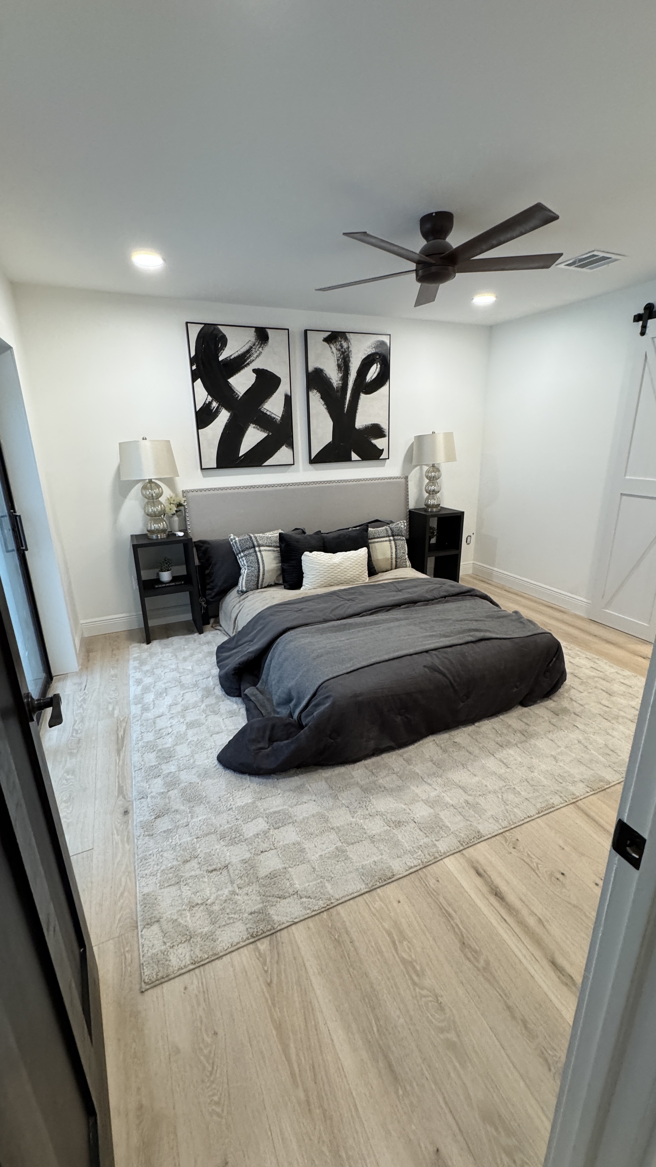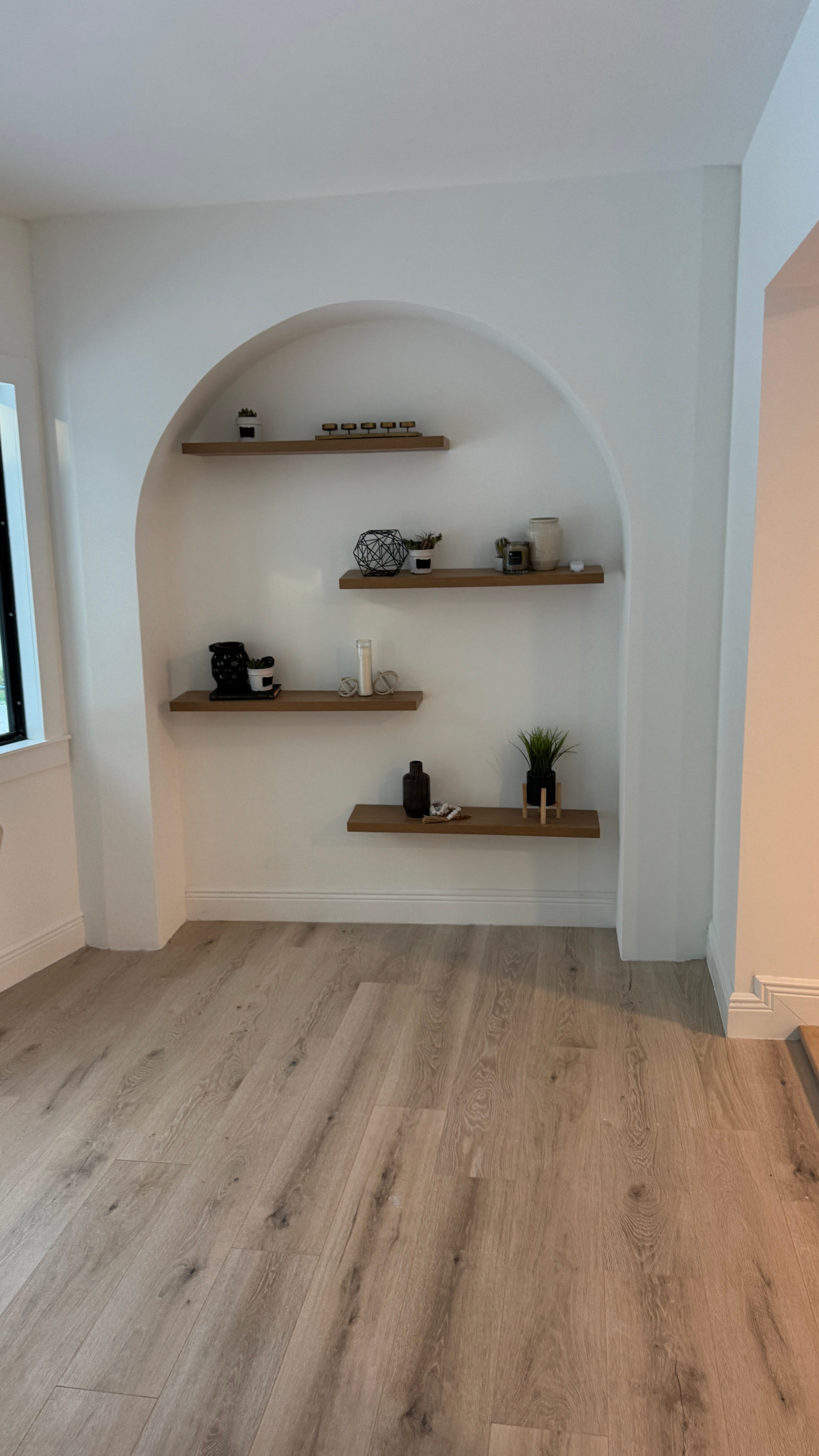 Architectural DetailsIt isn't just about fixtures; it's about the build. We created a custom arched drywall niche with floating wood shelves in the living area and installed sliding barn doors for the master suite. Luxury Vinyl Plank (LVP) flooring in a "Natural Oak" tone runs seamlessly throughout the entire home.